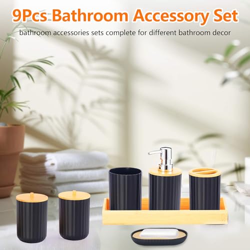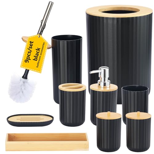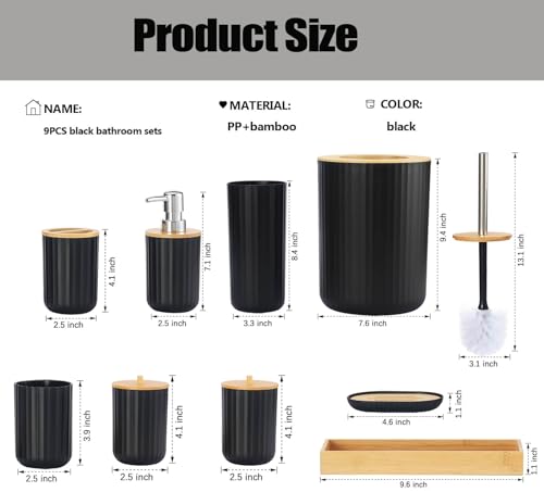 Lavatory Accent Set,9 Piece Black Bamboo Lavatory Equipment Set with Toothbrush Holder, Spherical Trash Can, Lotion Cleaning soap Dispenser, Toothbrush Cup, Self-importance Tray, Cleaning soap Dish, Bathroom Brush, Qtip Holder